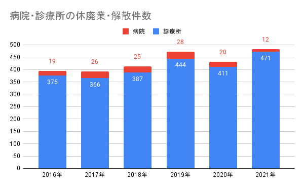帝国データバンクの調査によると、2021年には病院で12件、診療所で471件が休廃業・解散しています。これは過去最高水準であり、コロナ禍における医療機関経営の厳しさを物語っているように感じられます。