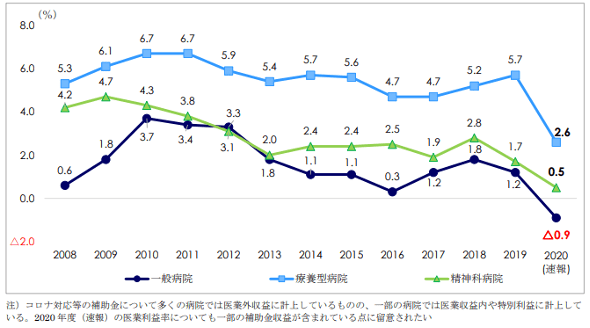 一方、経常収益率は2019(令和元)年度と比べ、一般病院0.3%と精神科病院0.1%とでわずかに上昇しましたが、療養型病院では -1.9%となりました。