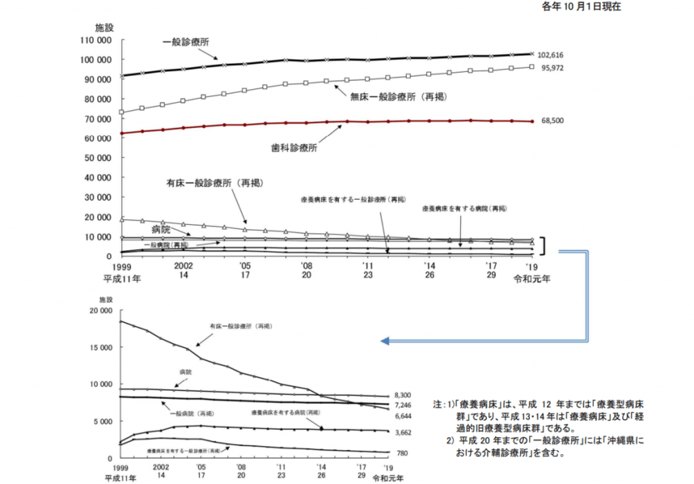 上のグラフから分かる通り、近年は一般病院や病床を持つ有床の一般診療所の数が減少しているのに対し、病床を持たない無床の一般診療所の数は増加しています。