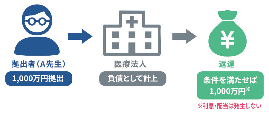 たとえば、A先生が医療法人に1,000万円を基金として拠出した場合、将来返還される金額も1,000万円のままです。